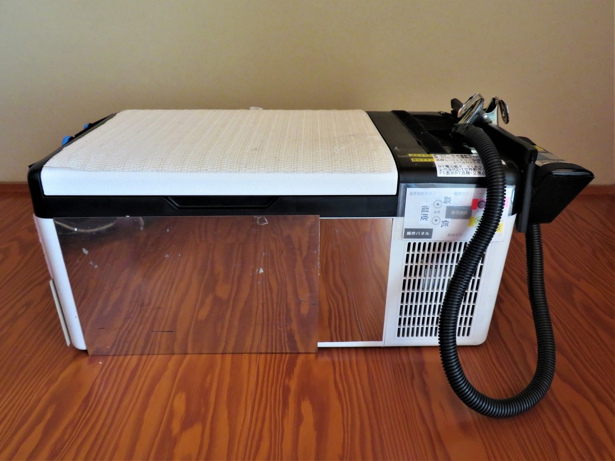 ▼ 下掲が、ポータブル冷凍冷蔵庫です。正面が輝いている部分は、貼り付けたマグネットが付くステンレス板です。