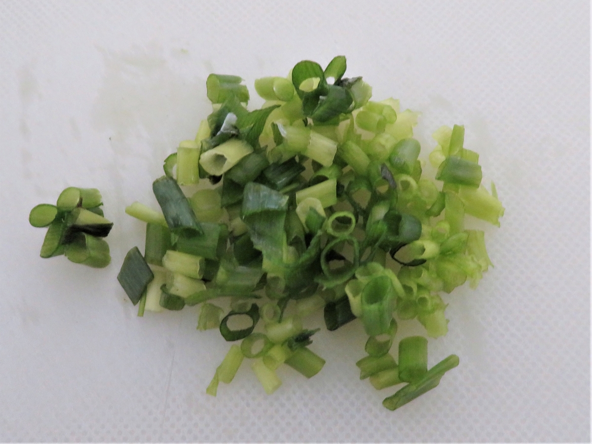 わかめが入った、かやくと粉末スープ、そして刻みネギを入れ‥。